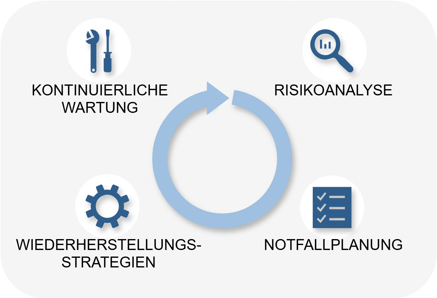 Auf dieser Basis wird die technische Lösung anschließend aufgebaut und getestet. Wiederanlaufübungen simulieren das Hochfahren nach einem Ausfall, um Schwachstellen zu identifizieren. Ein strukturiertes Wartungs- und Pflegekonzept stellt die kontinuierliche Wartung sowie regelmäßige Aktualisierung der Systeme sicher und gewährleistet dadurch dauerhaft deren Leistungsfähigkeit und Betriebssicherheit.